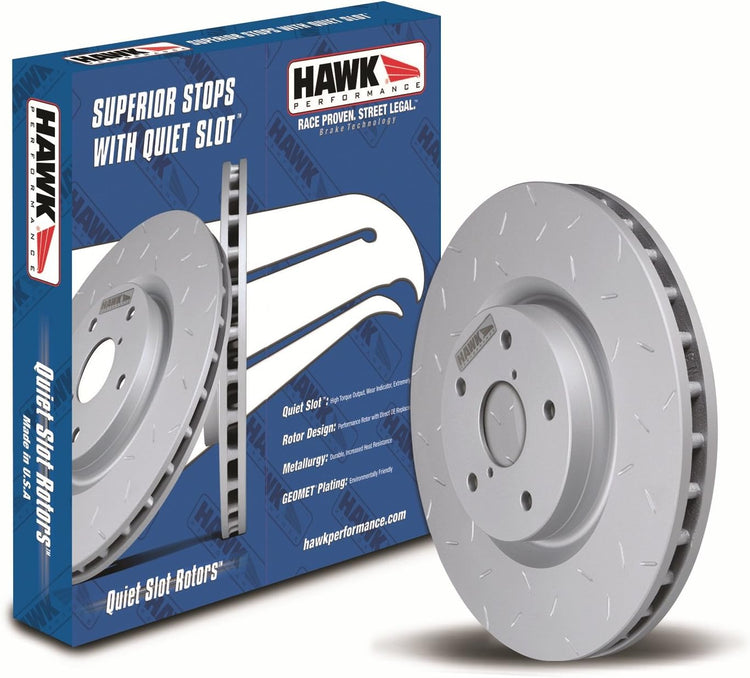 Get quiet stops with the all-new Quiet Slot rotors by Hawk Performance. Quiet Slot rotors are engineered specifically for automotive car and truck enthusiasts looking for high performance braking without the noise, dust and reliability issues commonly seen in heavily slotted, dimpled or cross-drilled aftermarket rotors. Some of the key features of the all-new Quiet Slot rotors are the advanced metallurgy, surface finish, and progressive structural and aerodynamic design. The Quiet Slot rotor program also addresses the needs of the automotive installer. The unidirectional vane and slot design eliminates the need to stock left hand and right hand rotors. Hawk Performance has also taken measures to decrease the impact of automotive products on the environment. All Quiet Slot rotors are finished with a GEOMET coating that protects both the internal and external surfaces from rust and corrosion. GEOMET is a proprietary water-based coating dispersion containing metal oxides, metallic zinc and aluminum flakes. The zinc and aluminum platelets align in multiple layers forming a metallic silver-gray coating. Applied as a liquid, the coating becomes totally inorganic after curing at 575-600 degree Fahrenheit (300-315 degree centigrade)